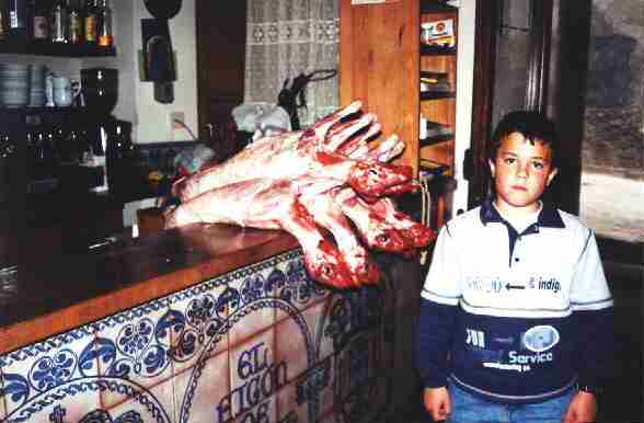 FIGONES Es el nombre que tienen los restaurantes del pueblo donde sirven el cordero lechal asado en horno de leña. Como se puede ver, los corderos están recién matados. En el figón de Ismael se come muy bien. |
