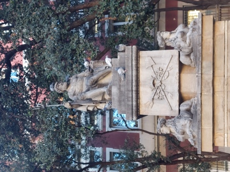 FUENTE DE NEPTUNO Fue creada en 1826 por el escultor Adrià Ferran. Representa al dios Neptuno sosteniendo su tridente, sobre un pedestal rodeado de cuatro espinges que expulsan el agua. Originalmente estuvo situada en el Muelle de la Riba en la Barceloneta. En 1919, a causa de una remodelación del puerto, la fuente fue traslada a los Jardines de Laribal en Montjuic. En 1975 con la construcción de la Fundación Miró, fue de nuevo trasladada y guardada en un almacén municipal, hasta que en 1983 fue colocada definitivamente en la Plaza de la Mercè. |