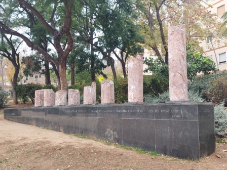MONUMENTO A BLAS INFANTE Fue una iniciativa del Centro Andaluz en Cataluña, en homenaje a Blas Infante, padre del nacionalismo andaluz. Se trata de una hilera de pequeñas columnas truncadas de altura irregular (ocho, como las provincias andaluzas), hechas con mármol rosa y situadas sobre una base aplacada de granito negro, obra de Josep Lluís Delgado en 1982. Al lado, hay un busto de Blas Infante, hecho en bronce por Xavier Cuenta Iturat en 1995. |