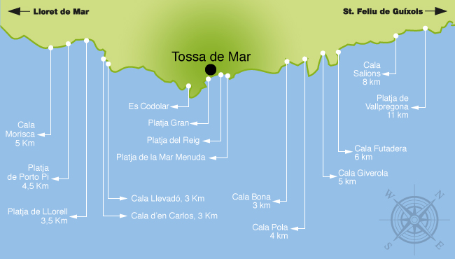 Blanes >> Lloret de Mar >> Tossa de Mar >> Sant Feliu de Guixols >> Platja d'Aro >> Calonge >> Calella de Palafrugell >> Palafrugell >> Begur >> Pals >> L'Estartit >> L'Escala >> Sant Martí d'Empuries >> Empúries >> Empuriabrava >> Roses >> Cadaqués >> El Port de la Selva >> La Selva de Mar >> Llançà >> Colera >> Portbou |