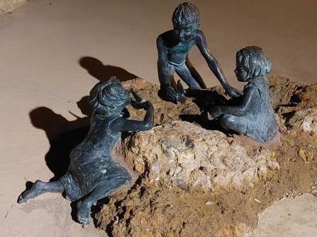 CONJUNTO ESCULTÓRICO Está situado en el antiguo puerto natural de Salou. Es una obra en bronce del año 2022 diseñada por la escultora Natalia Ferré. La estatua que representa al rey Jaume I el Conquistador, tiene 190 cm. de altura, 80 cm. de ancho y 60 cm. de fondo. Las figuras de los tres niños representan a un niño de 4 años, una niña de 7 años y uno de 10 años, jugando mientras los marineros preparaban las embarcaciones en el puerto natural de Salou. |