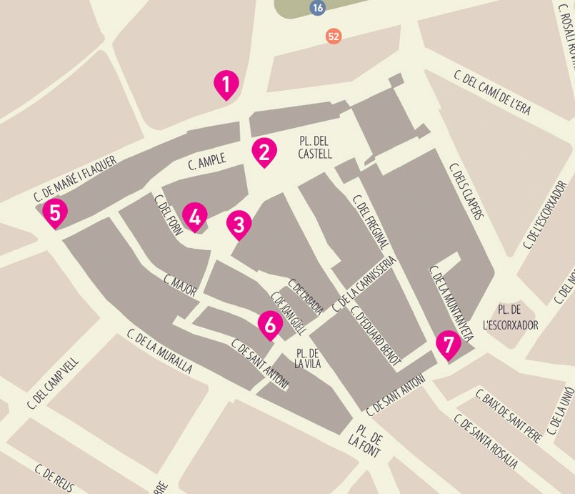 PLAZA DE LA VILA Junto con la Plaza del Castell, es uno de los espacios más emblemáticos del pueblo. Está presidida por el antiguo Ayuntamiento, donde ahora están las dependencias de la policía municipal. El edificio data de 1791, tal como indica la fecha grabada en el portal. Tiene planta baja y dos pisos y todas las aperturas están enmarcadas con piedra. |