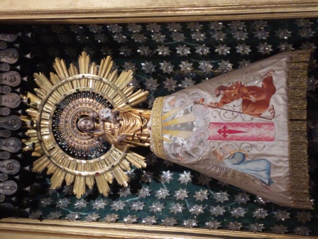 Entre los dos arcos se encuentra una reproducción de la imagen de la Virgen Blanca, patrona