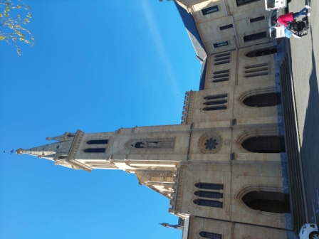 con grandes vidrieras y una gran torre-faro coronada por una cruz.