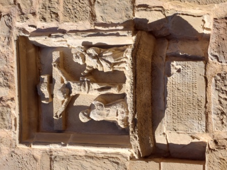 EL CRISTO Es un relieve dentro de una hornacina de piedra, sobre una lápida conmemorativa del S.XVI, incrustados en la fachada de una casa. El relieve muestra a Cristo crucificado, junto a la Virgen María y San Juan Evangelista. La inscripción ruega por el alma de un clérigo asesinado. |