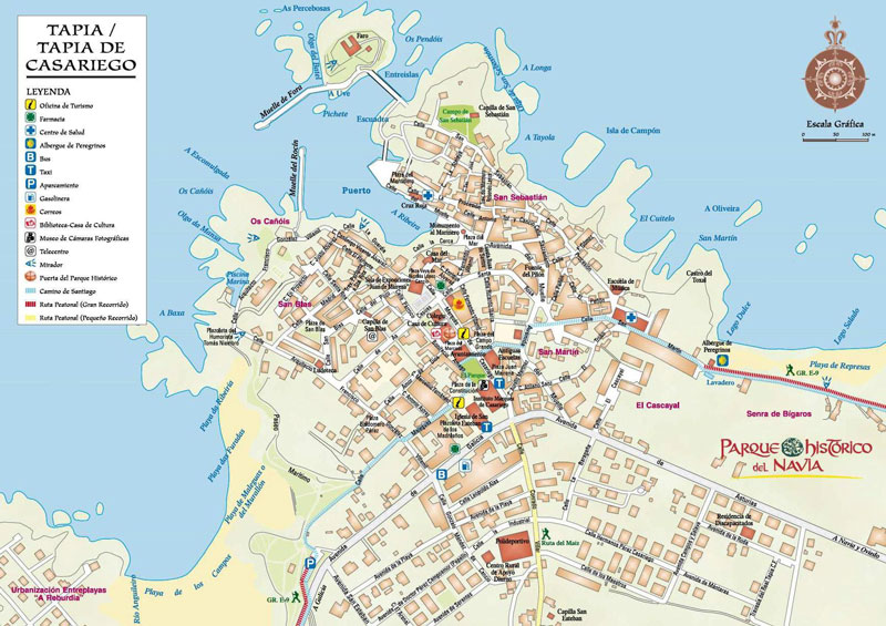 MONUMENTO A FERNANDO FERNÁNDEZ-CASARIEGO Rinde homenaje a Fernando Fernández-Casariego, primer Marqués de Casariego, fue costeado íntegramente por suscripción popular de los vecinos de Tapia como muestra de gratitud por su labor benefactora. La estatua es de 1929, hecha en bronce, con un pedestal de piedra que cuenta con relieves alegóricos. Uno de ellos representa a una mujer en actitud de agradecimiento, ofreciendo flores al marqués. También incluye el escudo nobiliario de la familia. |